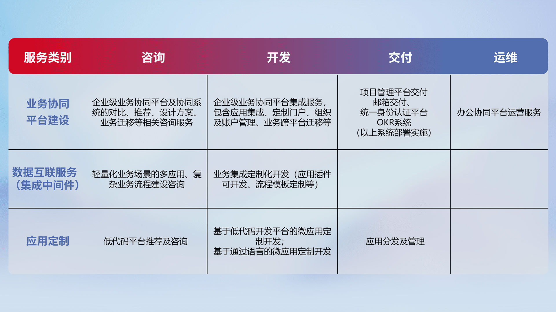 针对钉钉、、、企微、、、IDaas等平台级产品提供产品的规划、、方案、、、交付、、定制化开发等服务,,,实现如统一协同办公、、、、智能客户服务、、、混合会议管理、、、、智能数据查询、、、等业务场景,,,,实现数字化转型。。。
